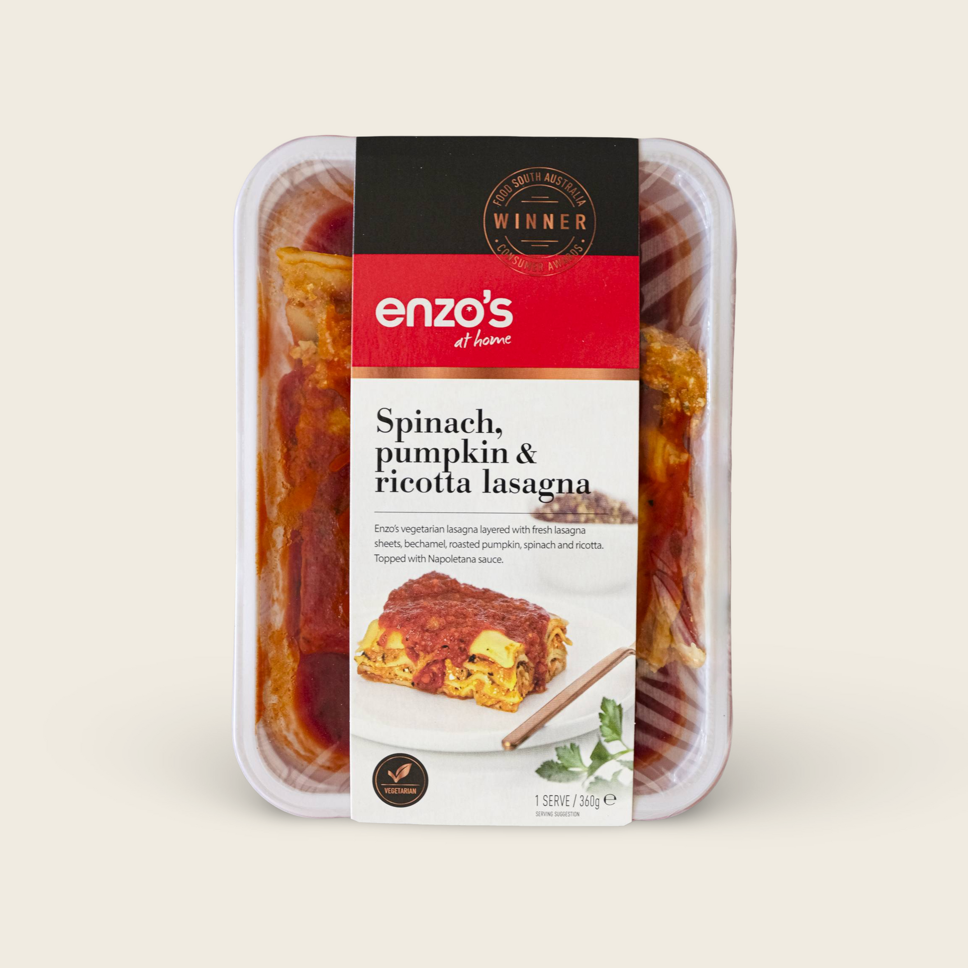 Napoletana sauce (46%) (tomato passata (tomato, food acid (citric acid)), water, onion, carrot, canola oil, olive oil, garlic, salt, tapioca starch, herbs, thickener (xanthan gum), spices), pasta (15%) (wheat semolina, water), bechamel sauce (14%) (milk, corn flour, butter, iodised salt, yeast extract, onion powder, herbs, spices), ricotta (11%) (whey, milk, food acid (citric acid, acetic acid), preservative (potassium sorbate), salt), pumpkin (5%), mozzarella cheese (milk, anti-caking agent (cellulose, powdered), preservative (sorbic acid)), spinach (3%), parmesan cheese (milk, salt, starter cultures (milk), coagulating enzyme (non-animal)), egg, salt, spices.